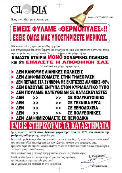 Η γκλορια ξεκαθαρίζει οτι κάνει μόνο χονδρικές πωλήσεις